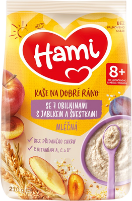 Každá miska kaše obsahuje potřebné vitamíny A, D a B₁. Hami mléčná kaše se 7 obilninami s jablkem a švestkami je vhodná volba pro večeři nebo snídani pro malá bříška.