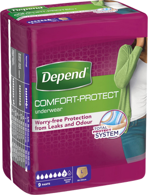 Dámské kalhotky Depend jsou vhodné i při silnějším úniku moči. Kalhotky jsou vyrobené z jemného bavlněného materiálu, který zajišťuje pohodlí a je šetrný k citlivé pokožce. Anatomicky tvarované savé jádro okamžitě pohltí tekutiny a neutralizuje nežádoucí pachy. Natahovací kalhotky zajišťují maximální ochranu, výborně padnou a díky jemnému materiálu se v nich budete cítit jako ve spodním prádle.