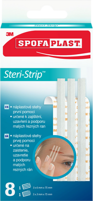 Spofaplast 801 Steri-Strip Náplasťové stehy 8 ksVše o produktuDoplňující informaceHodnocení produktuNáplasťové stehy udrží všechno pohromadě. Nechají vaši pokožku dýchat a pevně ji drží, aby se mohla rána zahojit. Ideální vybavení lékárničky. Pokud jde o ošetření menších ran, můžete náplasťovým stehům plně důvěřovat. Používejte je podle pokynů lékaře nebo poskytovatele zdravotní péče na ošetření drobných řezných ran a poranění u kožních stehů a svorek nebo jako podporu uzavřené rány po jejich odstranění. Jedno balení obsahuje 8 jednotlivých náplastí: 3 kusy – 6 mm x 75 mm, 5 kusů – 3 mm x 75 mm.