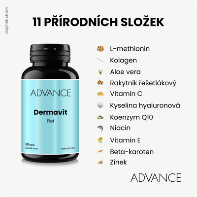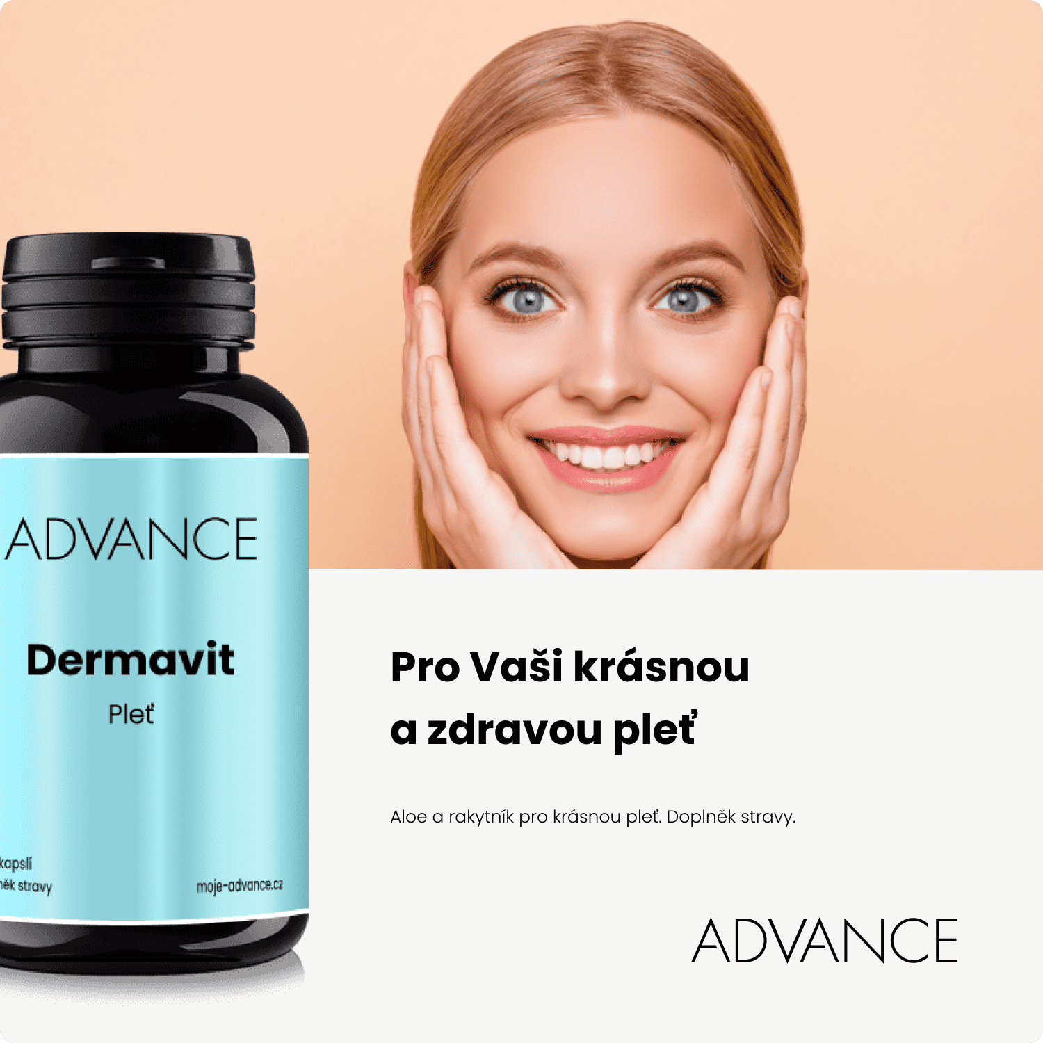 Dermavit Advance je nutrikosmetický doplněk stravy s komplexním složením, které kombinuje kolagen, kyselinu hyaluronovou, koenzym Q10, methionin, aloe vera, rakytník, niacin, zinek a vitaminy C a E. Více informací
