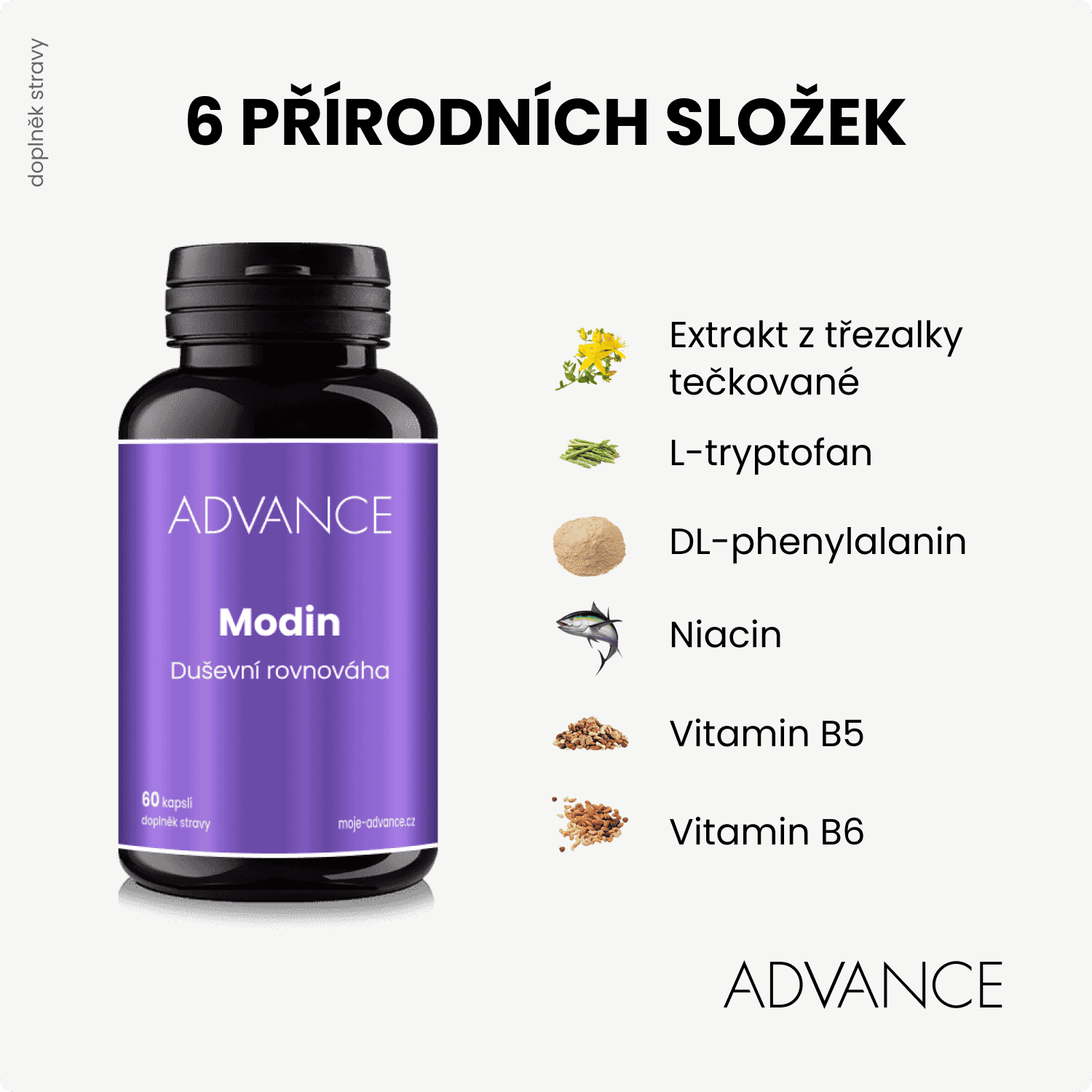 Modin obsahuje komplex přírodních látek, mezi které patří i vitaminy B3, B5 a B6, které přispívají k normální psychické činnosti a činnosti nervové soustavy. Více informací