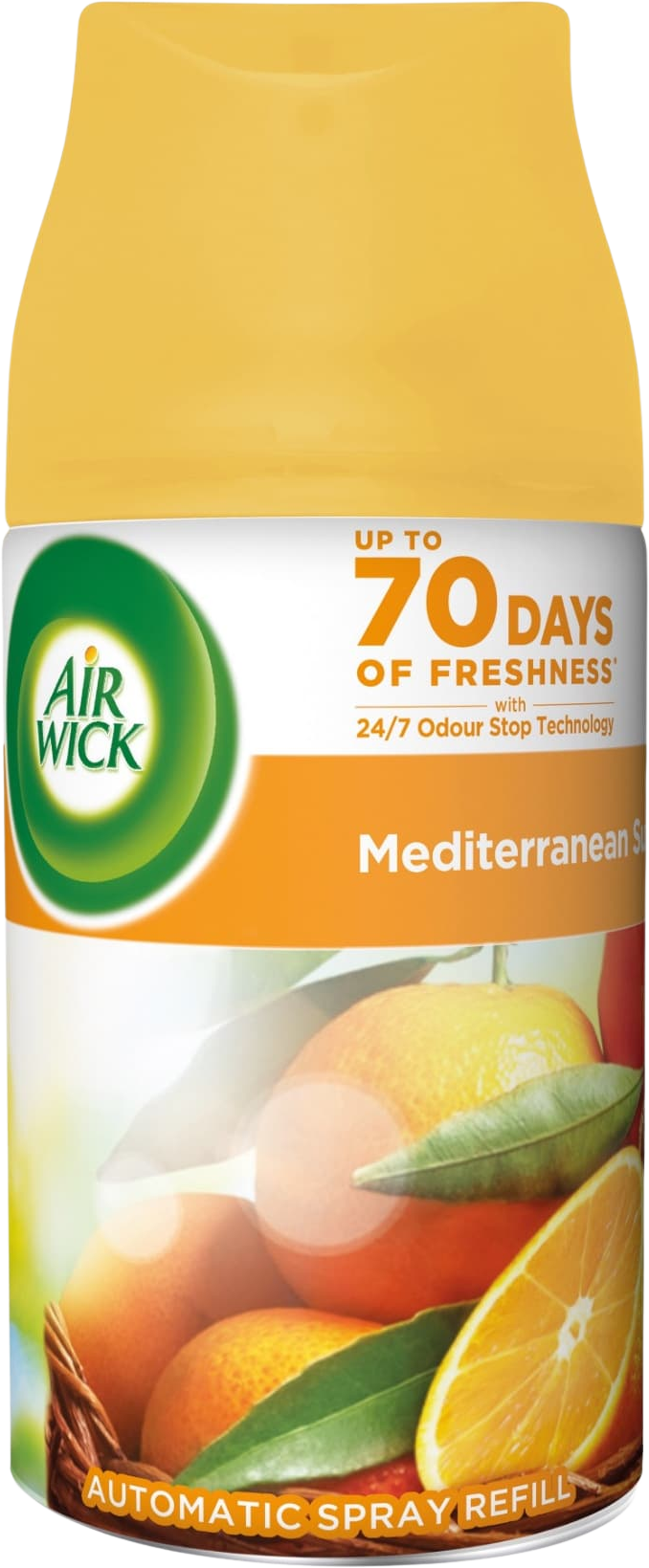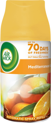 Airwick Náplň do automatického difuzéru Freshmatic Středomořské slunce 250 mlVše o produktuDoplňující informaceHodnocení produktuDíky osvěžovači vzduchu dosáhnete nepřetržitě svěžího aroma. Zcela jistě vás okouzlí svěží vůně Středomořského slunce. Náplň jednoduše vložíte do osvěžovače a nastavíte požadovanou úroveň intenzity. Vybrat si můžete z dávkování po dobu 9, 18 či 36 minut. Dle tohoto určení vám náplň Air Wick vydrží až 60 dnů.