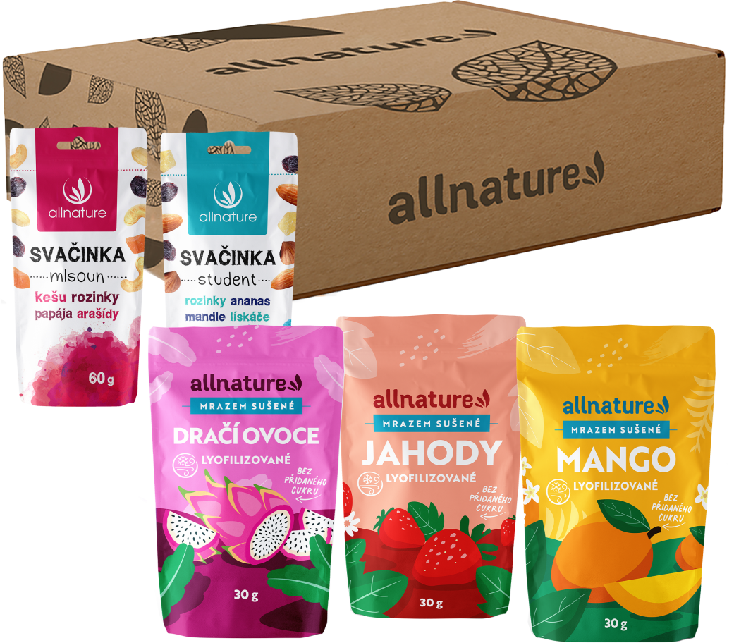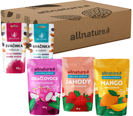 - Allnature Směs svačinka Student 60 g – klasika plná energie v podobě oříšků a sušeného ovoce, která nikdy nezklame