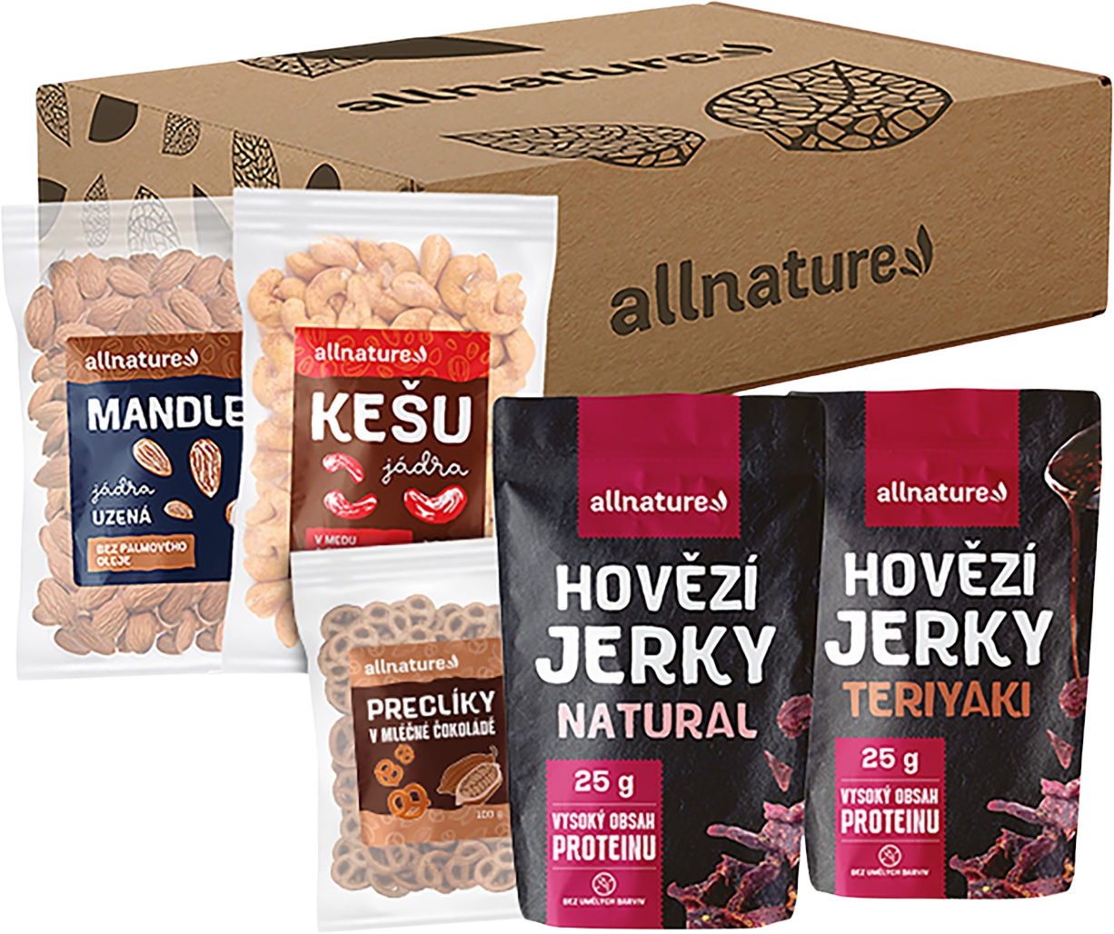 - Allnature BEEF Natural Jerky 25 g – čistá chuť kvalitního hovězího masa bez přidaných omáček, pro ty, kdo dávají přednost přirozenému charakteru snacku