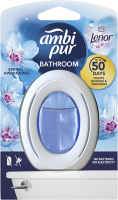 Ambipur Bathroom Osvěžovač Vzduchu Spring Awakening 7.5 mlVše o produktuDoplňující informaceHodnocení produktuOsvěžovač vzduchu do koupelny Ambi Pur Bathroom odstraňuje pachy ve vzduchu a současně pomáhá zabránit jejich nasáknutí do měkkých povrchů, jako jsou ručníky, koupelnové předložky a sprchové závěsy, po dobu až 50 dnů. Obsahuje pachové konvertory, což jsou vlastně různé molekuly parfémů, které se snadno vážou na širokou škálu molekul způsobujících zápach. Jakmile se na ně navážou a dojde k jejich chemické reakci, vzniknou nové molekuly, které už nejsou nepříjemně cítit. Pachové konvertory jsou zvláště účinné při dlouhodobém používání, takže vaše koupelna je vždy připravena na příchod hostů. Protože nepotřebujete elektřinu ani baterie, Ambi Pur Bathroom se pohodlně a snadno používá. Je dostupný v různých vůních.