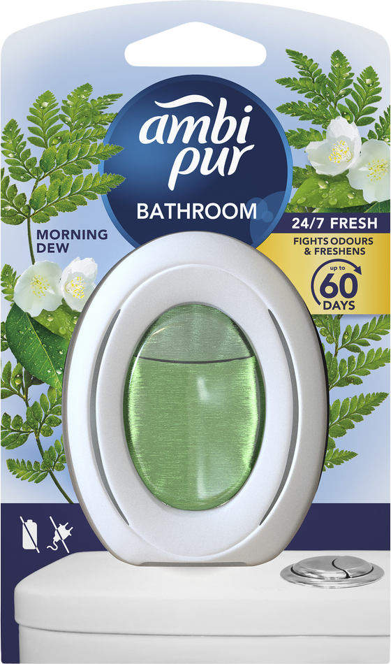 Osvěžovač vzduchu do koupelny Ambi Pur Bathroom odstraňuje pachy ve vzduchu a současně pomáhá zabránit jejich nasáknutí do měkkých povrchů, jako jsou ručníky, koupelnové předložky a sprchové závěsy, po dobu až 50 dnů. Obsahuje pachové konvertory, což jsou vlastně různé molekuly parfémů, které se snadno vážou na širokou škálu molekul způsobujících zápach. Jakmile se na ně navážou a dojde k jejich chemické reakci, vzniknou nové molekuly, které už nejsou nepříjemně cítit. Pachové konvertory jsou zvláště účinné při dlouhodobém používání, takže vaše koupelna je vždy připravena na příchod hostů. Protože nepotřebujete elektřinu ani baterie, Ambi Pur Bathroom se pohodlně a snadno používá. Je dostupný v různých vůních.