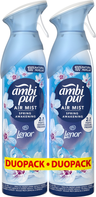 Ambipur Spring Awakening Osvěžovač vzduchu ve spreji 2 x 185 mlVše o produktuDoplňující informaceHodnocení produktuOsvěžovač vzduchu AmbiPur s technologií OdourClear odstraňuje nepříjemné vytrvalé pachy a zanechává lehkou svěží vůni. Spring Awakening je lehká zelená vůně inspirovaná jarní přirozenou svěžestí Lenoru. Vůně AmbiPur ve spreji jsou nehořlavé a obsahují 100% přírodní hnací plyn. Díky tomu se skvěle hodí do jakékoli místnosti v domácnosti.
