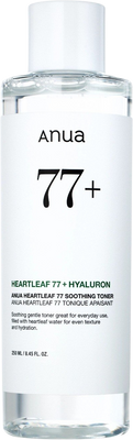 Anua Heartleaf 77% Soothing Toner Zklidňující pleťové tonikum 250 mlVše o produktuDoplňující informaceHodnocení produktuObjevte sílu korejské péče s tímto výjimečným zklidňujícím tonikem obsahujícím 77% extraktu ze srdcovky (Houttuynia Cordata). Tento přírodní extrakt je známý svými protizánětlivými a zklidňujícími vlastnostmi, které pomáhají redukovat podráždění a zarudnutí citlivé pleti.