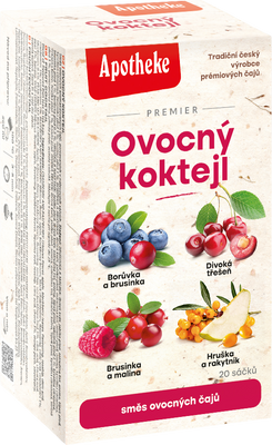 Apotheke Premier, ovocný koktejl směs čajů 5 x 4 sáčkůVše o produktuDoplňující informaceHodnocení produktuApotheke čaj Ovocný koktejl 4v1 obsahuje 4 druhy lahodných ovocných čajů, které lze pít teplé i studené pro osvěžení.