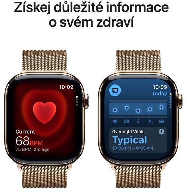 Apple Watch 11 GPS + Cellular 46mm Zlatý titan se zlatým milánským tahem - S/MVše o produktuDoplňující informaceHodnocení produktuČím víc informací máš, tím víc toho pro sebe můžeš udělat. Apple Watch Series 11 ti umožňují udržovat si skvělý přehled o zdraví – od EKG až po Životní funkce a další. Navíc udělaly ohromný krok vpřed v oblasti zdraví srdce a mají převratnou novou funkci – oznámení o hypertenzi.