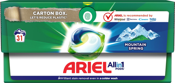 Díky recyklovatelnému kartonovému balení ECOCLIC nyní kapsle na praní Ariel navíc pomáhají snižovat množství plastů. Obsahuje pouze maximálně 5 % plastu a je navržen tak, aby kapsle bezpečně uchoval.