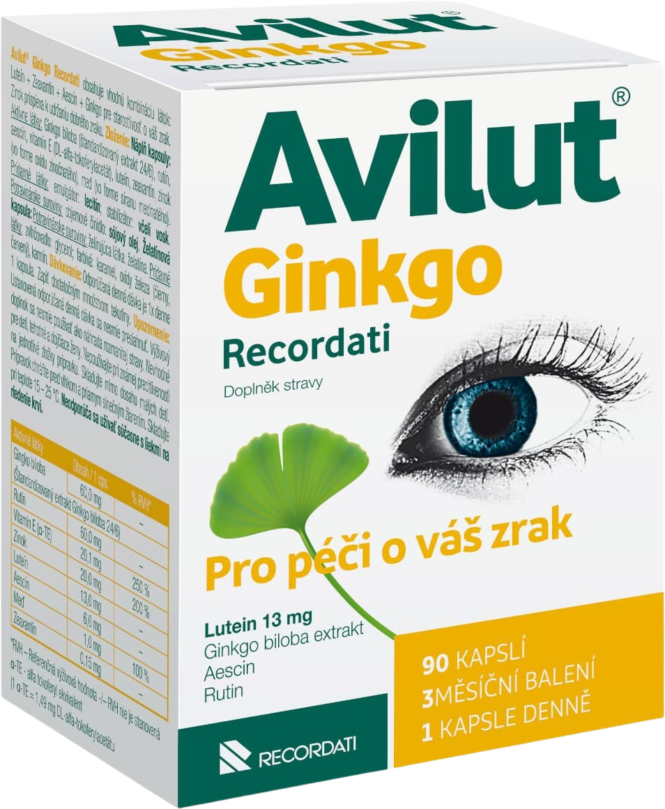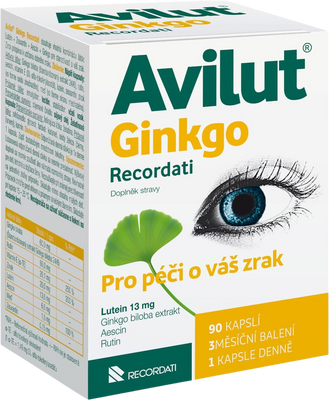 Doplněk stravy Avilut® Ginkgo Recordati obsahuje ginkgo bilobu, rutin, aescin, vitamin E, lutein, zeaxanthin, měd’ a zinek, který přispívá k udržení normálního stavu zraku.