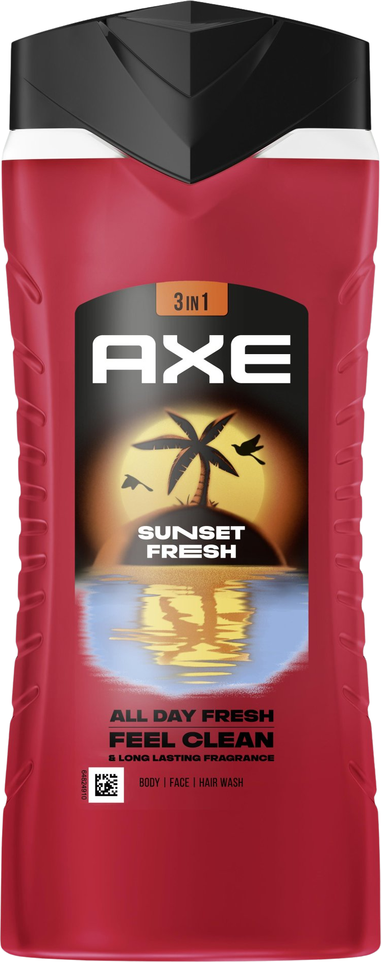 Svěží přírodní vůně díky netradičnímu spojení těch nejexotičtějších a nejdivočejších ingrediencí. Jemně čistí a zanechává příjemný pocit svěžesti. AXE Sunset Fresh je inspirován přírodou a obohacen esenciálními oleji. Poznejte naprosto nový nevšední zážitek! Nová formulace s obsahem 100% přírodních prebiotik likvidujících bakterie pro ještě intenzivnější svěžest, 5x více hydratačních složek, bez parabenů. Nanes na vlhkou pokožku, napěň, vmasíruj a důkladně opláchni. Dermatologicky testováno. Více informací