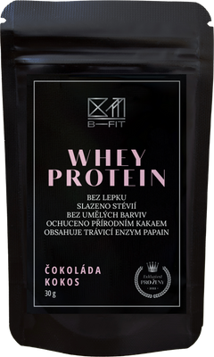 B-Fit Club Whey Protein Exclusive Čokoláda-kokos 30 gVše o produktuDoplňující informaceHodnocení produktuWhey Protein Exclusive je zcela přírodní produkt, který je vhodný pro sportovce, napomáhá s růstem svalů, jejich ochranou a při celkově správně nastaveném příjmu potravin podporuje také spalování tuku. Protein není určen pouze pro sportovce, je vhodný pro všechny lidi, kteří se zajímají o svou stravu a chtějí si zajistit dostatečný příjem kvalitních, lehce stravitelných bílkovin. Díky svému univerzálnímu využití o ideální doplněk pro maximální podporu celkového zdraví organismu a jistě se stane nepostradatelnou součástí Vašeho zdravého životního stylu. Whey Protein Exclusive je slazen pouze stévií. Stévie je přírodní sladidlo, které je na rozdíl od cukru téměř nekalorické a je vhodné i pro diabetiky.