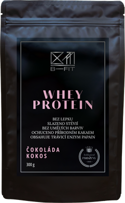 B-Fit Club Whey Protein Exclusive Čokoláda-kokos 300 gVše o produktuDoplňující informaceHodnocení produktuWhey Protein Exclusive je zcela přírodní produkt, který je vhodný pro sportovce, napomáhá s růstem svalů, jejich ochranou a při celkově správně nastaveném příjmu potravin podporuje také spalování tuku. Protein není určen pouze pro sportovce, je vhodný pro všechny lidi, kteří se zajímají o svou stravu a chtějí si zajistit dostatečný příjem kvalitních, lehce stravitelných bílkovin. Díky svému univerzálnímu využití o ideální doplněk pro maximální podporu celkového zdraví organismu a jistě se stane nepostradatelnou součástí Vašeho zdravého životního stylu. Whey Protein Exclusive je slazen pouze stévií. Stévie je přírodní sladidlo, které je na rozdíl od cukru téměř nekalorické a je vhodné i pro diabetiky.