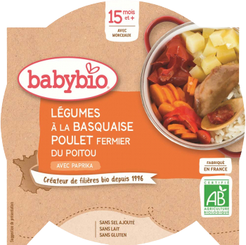 Zeleninové potěšení s bio kuřetem po baskicku a rýží. Receptury od ukončeného 15. měsíce jsou navrženy výhradně ze zeleniny, masa, ryb, rýže nebo quinoa … a v talířku, aby si dítě přivykalo na jejich autentickou chuť a naučilo se jíst pokrm samostatně.