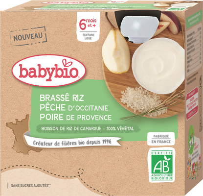 BIO příkrm (brassé) od 6 měsíců z rýžového mléka. Kombinace rýžového bio mléka, broskví a hrušek. Krémový a osvěžující mléčný dezert s jemnou chutí pro všechny malé jedlíky. Bez laktózová alternativa k mléčným dezertům vyrobeným z mléka živočišného původu. Více informací
