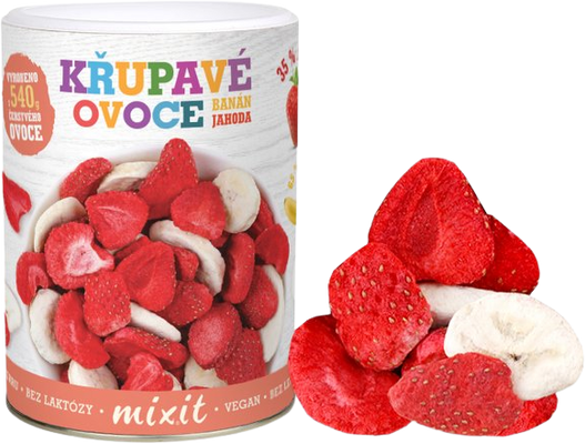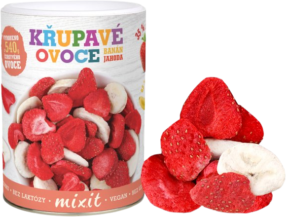 Lyofilizované ovoce (banán 65 % a jahody 35 %).
