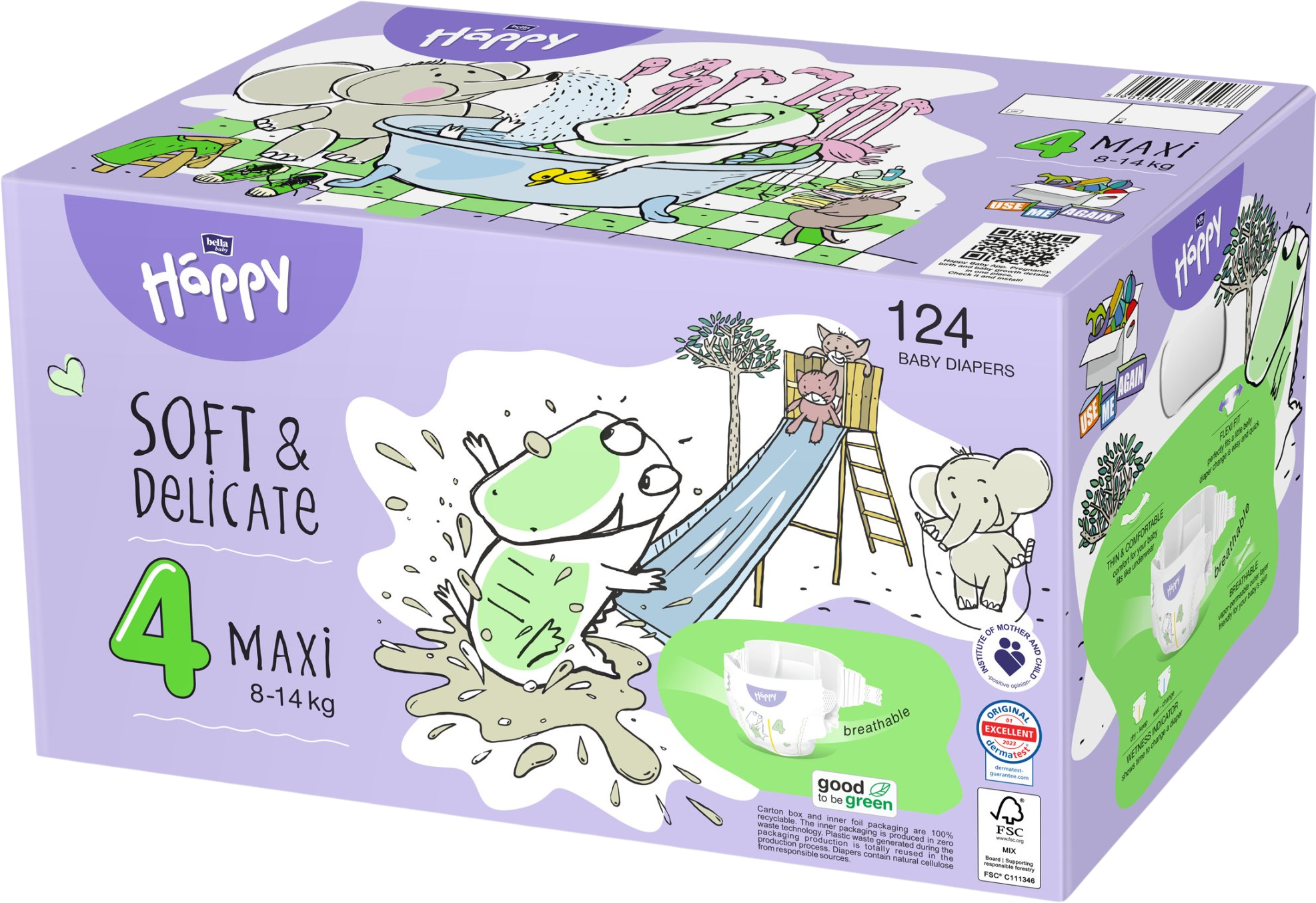 Happy Toy box ve velikosti Maxi obsahuje 2 balení plen Happy Soft & Delicate Maxi (4) po 62 kusech. Kartonová krabice s potiskem je použitelná jako box k uchování plen nebo dětských hraček.