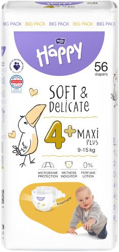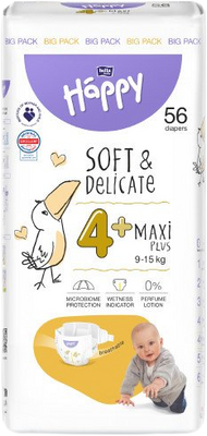 Dětské pleny Happy Soft & Delicate Maxi Plus (4+) jsou doporučeny pro novorozence s hmotností 9-15 kg. Jsou vyrobeny z nejkvalitnějších materiálů, dokonale se přizpůsobí tělu dítěte a poskytují příjemný pocit sucha. Jsou navrženy tak, aby vyhovovaly potřebám té nejcitlivější pokožky – neobsahují žádné alergeny a minimalizují riziko vzniku opruzenin.