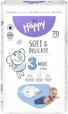 Dětské pleny Happy Soft & Delicate Midi (3) jsou vyrobeny z nejkvalitnějších materiálů, dokonale se přizpůsobí tělu dítěte a poskytují příjemný pocit sucha. Více informací