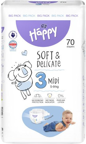 Dětské pleny Happy Soft & Delicate Midi (3) jsou doporučeny pro novorozence s hmotností 5-9 kg. Jsou vyrobeny z nejkvalitnějších materiálů, dokonale se přizpůsobí tělu dítěte a poskytují příjemný pocit sucha. Jsou navrženy tak, aby vyhovovaly potřebám té nejcitlivější pokožky – neobsahují žádné alergeny a minimalizují riziko vzniku opruzenin.