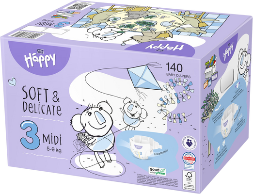 Dětské pleny Happy Soft & Delicate Midi (3) jsou doporučeny pro novorozence s hmotností 5-9 kg. Jsou vyrobeny z nejkvalitnějších materiálů, dokonale se přizpůsobí tělu dítěte a poskytují příjemný pocit sucha. Jsou navrženy tak, aby vyhovovaly potřebám té nejcitlivější pokožky – neobsahují žádné alergeny a minimalizují riziko vzniku opruzenin.