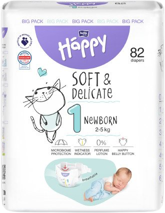 Dětské pleny Happy Soft&Delicate Newborn (1) jsou doporučeny pro novorozence s hmotností 2–5 kg. Jsou vyrobeny z nejkvalitnějších materiálů, dokonale se přizpůsobí tělu dítěte a poskytují příjemný pocit sucha. Jsou navrženy tak, aby vyhovovaly potřebám té nejcitlivější pokožky – neobsahují žádné alergeny a minimalizují riziko vzniku opruzenin.