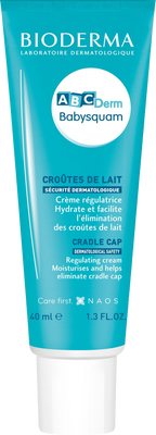 Krém Bioderma ABCDerm Babysquam pomáhá odstraňovat kožní šupinky/mléčné krusty z dětské pokožky hlavy. Krém pokožku zvlhčuje, hydratuje a zanechává ji jemnou. Navíc nelepí a snadno se smývá šamponem, takže není potřeba vyčesávat. Může být používán od narození (vyjma předčasně narozených dětí).