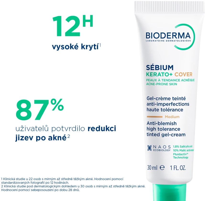 Sébium Kerato+ Cover je inovativní tónovací péče vyvinutá dermatology pro pleť se sklony k akné. Spojuje dermokosmetickou péči a dlouhotrvající krycí efekt až na 12 hodin v jediném kroku. Pomáhá minimalizovat viditelnost pupínků a skvrn, sjednocuje tón pleti a zároveň respektuje její přirozenou rovnováhu.