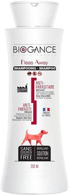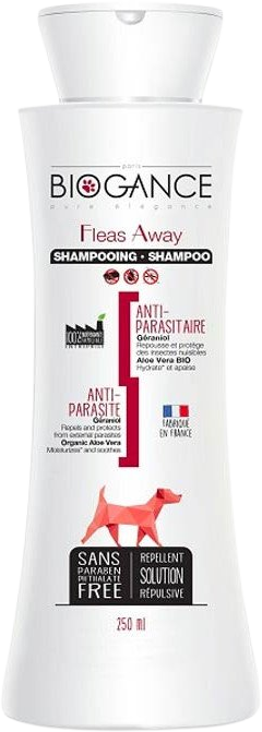 Repelentní šampón Biogance šampón Fleas away má díky obsahu esenciálních olejů z tymiánu a levandule preventivní a ochranný účinek před blechami, klíšťaty a jinými vnějšími parazity.