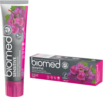 Z 98 % přírodní zubní pasta s BIO certifikací speciálně navržená pro potřeby citlivých zubů. Amorfní hydroxyapatit vápníku, hořčíku, zinku a L-arginin pomáhají posilovat a obnovovat zubní sklovinu a poskytují úlevu od citlivosti zubů. Jedinečná směs voňavého extraktu z jadérek červených hroznů a kadidlového a mateřídouškového oleje pečuje o měkké tkáně, má antioxidační a antibakteriální účinky a chrání před zubním kazem. Enzym bromelain získávaný z extraktu z ananasu účinně rozkládá nahromaděný plak, zatímco výtažky z jitrocele, listů břízy a dubové kůry zklidňují dásně. Esenciální oleje z citronové kůry, máty a citrát zinečnatý účinně osvěžují dech. Hrozny a máta propůjčují pastě její zajímavou příchuť. Obsahuje celkem 23 složek přírodního původu. Zubní pasta je vhodná pro celou rodinu, včetně dětí od 6 let, vegany i vegetariány. Bez fluoridu. Bez lepku. Bez SLS, PEG, sacharinu. Účinky klinicky ověřeny. 100 g.