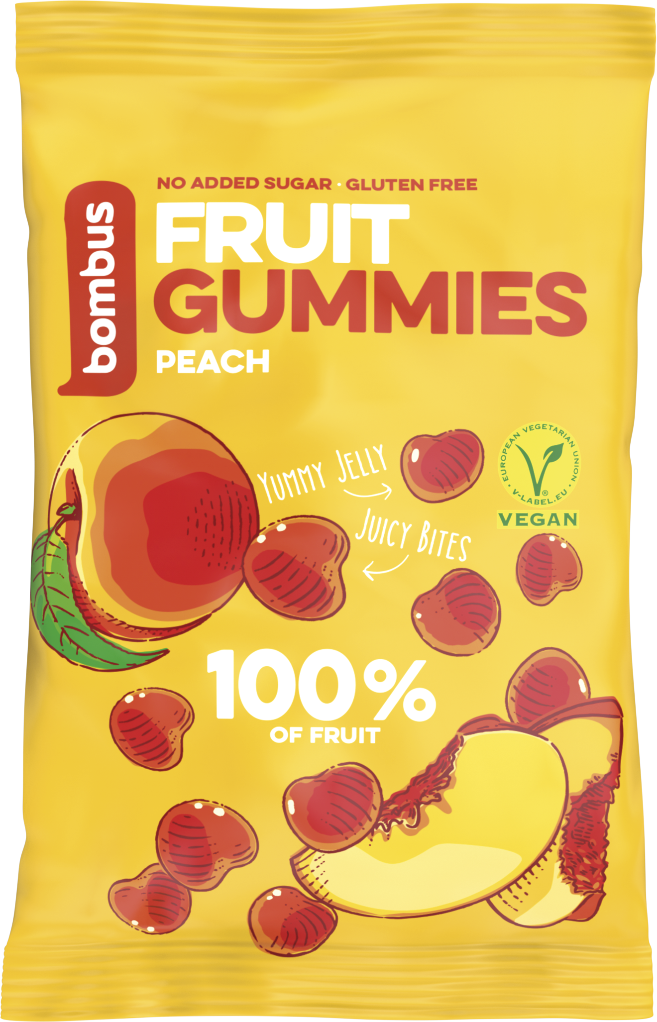 Broskvové gummies se svěží ovocnou chutí, obsahují 100 % ovocné složky a jsou bez přidaného cukru, barviv a konzervantů. Více informací