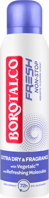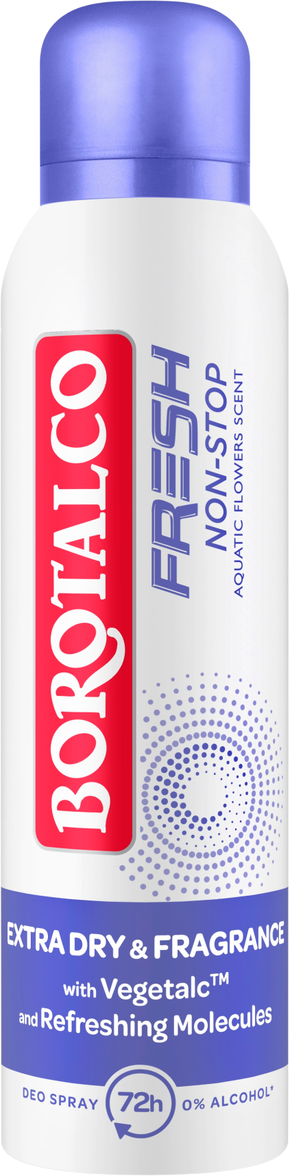 Borotalco Deo ve spreji Fresh Aquatic Flowers 150 mlVše o produktuDoplňující informaceHodnocení produktuExtra suchý účinek a extra vůně, abyste se vždy cítili v pohodě. Nový zážitek Borotalco s deodorantem Borotalco Fresh Non-Stop! Jeho složení obohacené o VegetalcTM, směs absorpčních prášků na rostlinné bázi, a osvěžující molekuly s nepřetržitým uvolňováním vůně nabízí extra suchou ochranu a dlouhotrvající svěžest na pokožce.