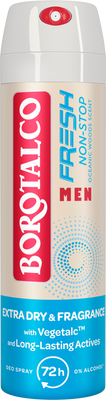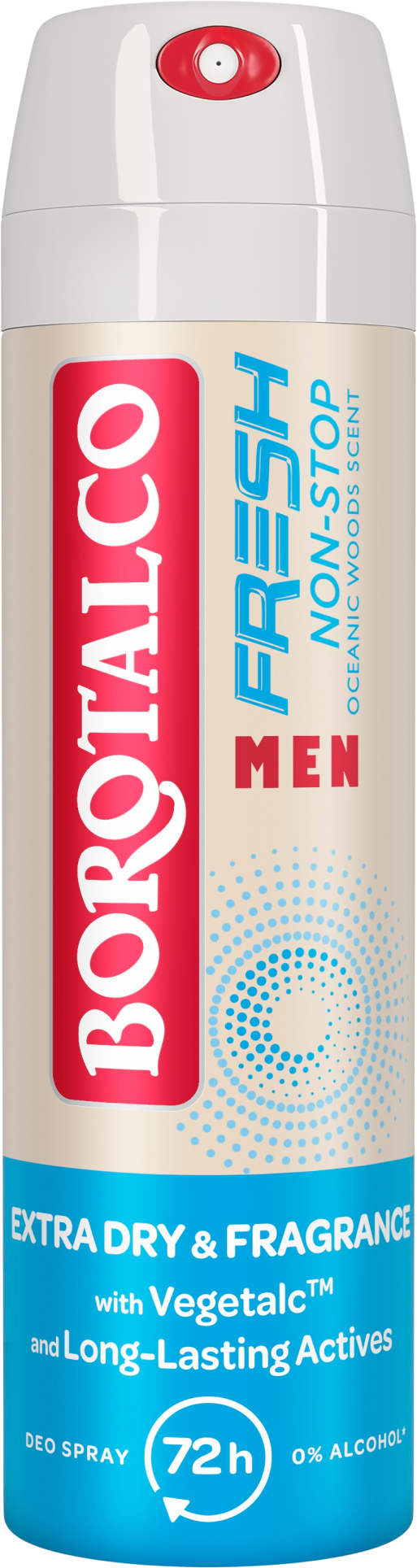 Extra suchý účinek a extra vůně, abyste se vždy cítili v pohodě. Nový zážitek Borotalco s Borotalco Fresh Non-Stop deodorantem! Jeho složení obohacené o VegetalcTM, směs absorpčních prášků na rostlinné bázi, a louhotrvající aktivní látky a poskytuje pocit dlouhotrvající svěžesti a mimořádné vůně na pokožce.