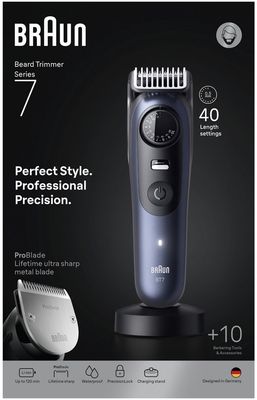 Originální název | Braun Beard Trimmer Series 7, +10 Barbering Tools, 40 Lengths, ProBlade, BT7540, Blue |