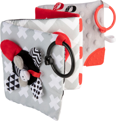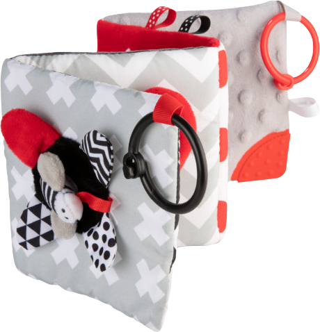 Měkká edukativní knížka z kolekce Sensory značky Canpol babies dokonale stimuluje vývoj hmatu dítěte. Jednotlivé prvky jsou vyrobeny z materiálů s různou strukturou: hladké a drsné, šustící a načechrané. Kniha má také praktické kousátko a zrcadlo, ve kterém vidí děťátko svůj odraz. Knížka obsahuje oddělitelné prvky, díky čemuž může dítě procvičovat motorické dovednosti ruky. Černá a bílá jsou kontrastní barvy, které dítě vnímá jako první, díky tomu je kniha ideální i pro novorozence.