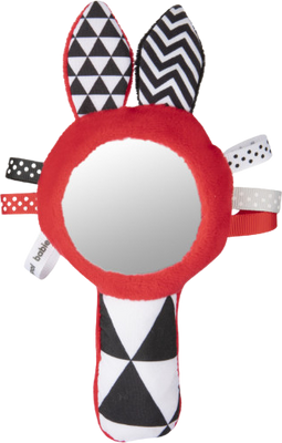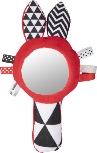 Krásně zpracovaná kontrastní hračka, která obsahuje pískací prvek a zrcátko, kde se miminko může pozorovat. Látkové stužky po bocích hračky vždy zaujmou a miminko se je snaží trpělivě chytat prstíčky. Tato kombinace barev je ideální pro první měsíce miminka a opravdu dokáže zaujmout.