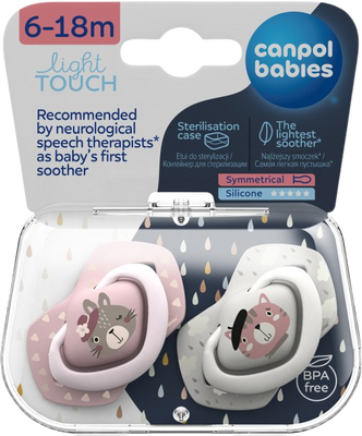 Dudlíky Light touch jsou malé a lehké - jedná se o nejlehčí dudlíky z nabídky od značky Canpol babies. Jsou určeny pro děti ve věku 6-18 měsíců, neobsahují BPA a v balení, v podobě sterilizační kapsle, jsou umístěny 2 ks dudlíků.