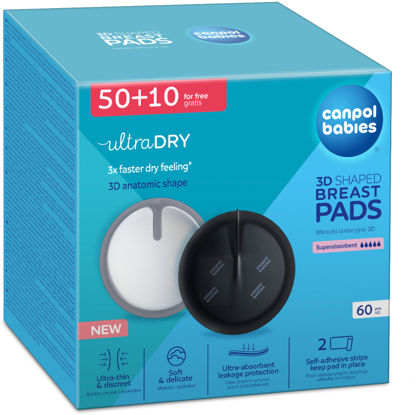 Prodyšné jednorázové vložky do podprsenky Canpol babies jsou určeny ženám v pozdější fázi těhotenství a kojícím matkám. Nedráždí citlivou pokožku prsu ani bradavky. Měkká absorpční vrstva zadržuje vytékající mléko a nepropustná vnější vrstva zabraňuje ušpinění prádla. Samolepící páska pomáhá fixovat vložku na správném místě. Vložky se výborně přizpůsobí tvaru prsu a jejich použití je velmi diskrétní. Dodávají se v balení po 60 kusech.