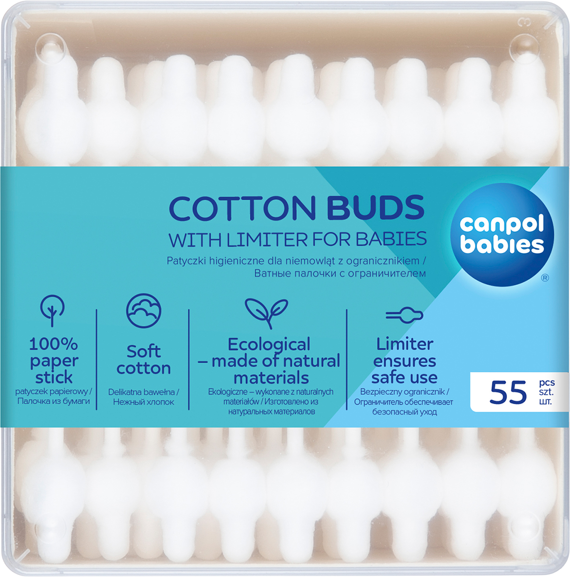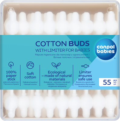 Tyčinka je vyrobena ze 100% papíru — ekologická alternativa k plastovým tyčinkám. Vatová koncovka je vyrobena ze 100% bavlny. Tvar bavlněné části s omezovačem zajišťuje bezpečné použití. V balení naleznete 56 ks.