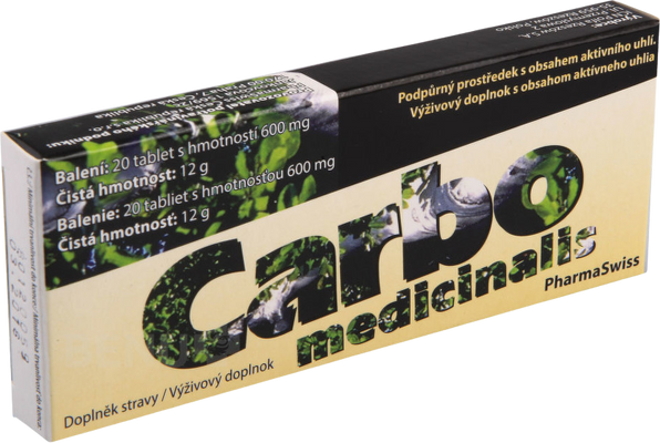 Carbo medicinalis PharmaSwiss obsahuje 20 tablet. Používám při žaludečních nevolnostech (průjmu) nebo nadýmání a opravdu zabírá. Je přírodní, tak podávám i svému psovi, když má průjem.