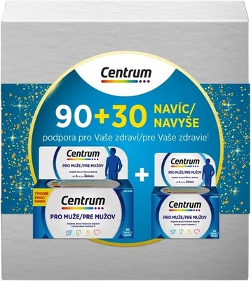Centrum Multivitamín pro muže dárkové balení 90 + 30 tabletVše o produktuDoplňující informaceHodnocení produktuCentrum multivitamin pro muže je doplněk stravy, který obsahuje vyvážené množství vitamínů, minerálů a stopových prvků pro podporu výživy mužů. Přípravek má vyšší obsah vitaminu D (400 IU), hořčíku a vitaminů skupiny B. Vápník, vitamin D a hořčík jsou potřebné pro správné fungování svalů. Přípravek mohou ho užívat i osoby citlivé na lepek a diabetici. Krásný vánoční dárek pro muže. 30 tablet navíc zdarma.