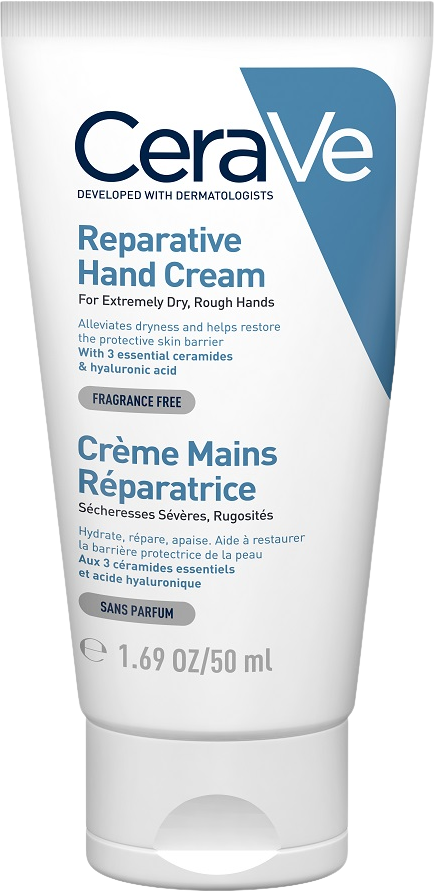 Obnovující krém na ruce CeraVe obsahuje ceramidy, zklidňující omega oleje, kyselinu salicylovou a kyselinu hyaluronovou. Ceramidy jsou lipidy přirozeně se vyskytující v pokožce a jsou nezbytnou součástí kožní bariéry, která zabraňuje dehydrataci.
