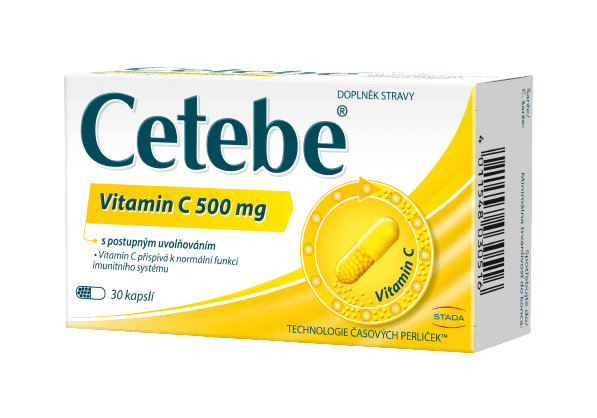 Vitamín C s postupným uvolňováním. V kapslích Cetebe jsou vitamíny obsaženy ve formě tzv. časových perliček™, které se rozpouštějí postupně a uvolňují tak vitamíny do těla v optimál…