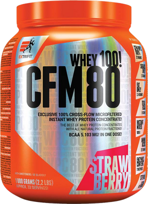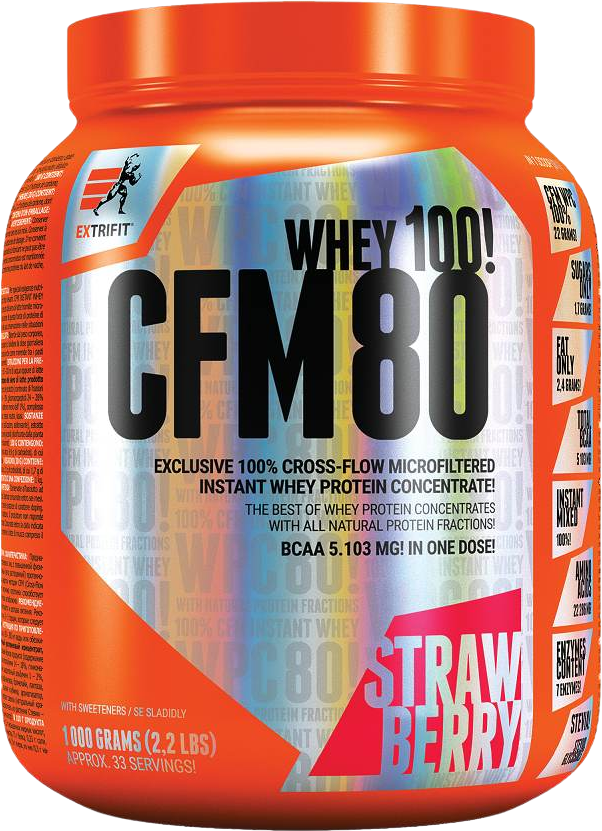 Obrovským benefitem je zachování všech bílkovinných frakcí (podívejte se na složení). Do Vašeho proteinu CFM Instant Whey 80 jsme přidali komplex sedmi enzymů pro dokonalé strávení proteinu a zabudování bílkovin do svalové hmoty. Jedná se o enzymy: papain, alfa amyláza, bromelain, laktáza, celuláza, neutrální proteáza a lipáza. Jako hlavní sladidlo jsme pak zvolili sladidlo z rostliny stévie 97 %! CFM Instant Whey 80 Vám nabízíme ve 12 vynikajících příchutích. V ovocných příchutích je obsaženo pravé, sušené ovoce (tedy žádná chemie) a na chuti je to obrovsky znát! Nyní si troufneme tvrdit, že náš protein CFM Instant Whey 80 chutná nejlépe ze všech! Chuť je plná, výrazná a nápoj nádherně krémový. Obsah proteinu je 72,4 – 76,2 % (liší se podle příchuti). Kromě skvělého složení je tento náš výrobek oblíben díky snadné a bezproblémové přípravě – je výborně rozpustný, nepráší ani netvoří hrudky.