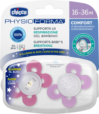 Chicco Dudlík Physio Comfort silikon noční 16-36m dívka - hvězdy/méďa 2 ksVše o produktuDoplňující informaceHodnocení produktuDudlík Chicco Physio Comfort řady Physioforma patří mezi aktivní ortodontické uklidňující dudlíky. Kotouč dudlíku Physio Comfort byl speciálně navržen tak, aby byl co nejmenší možnou styčnou plochou s dětskou tvářičkou a poskytl i té nejcitlivější pokožce se sklonem k podráždění maximální komfort. Dotýká se okolí úst pouze ve čtyřech malých bodech!