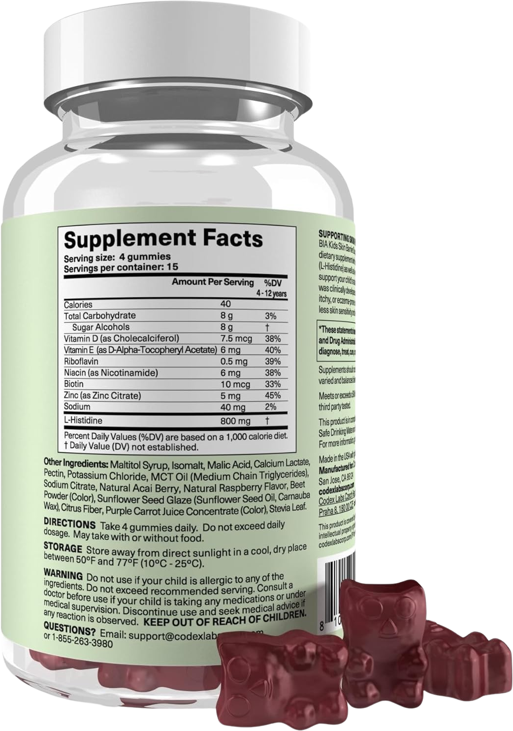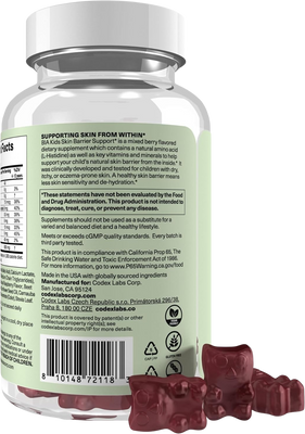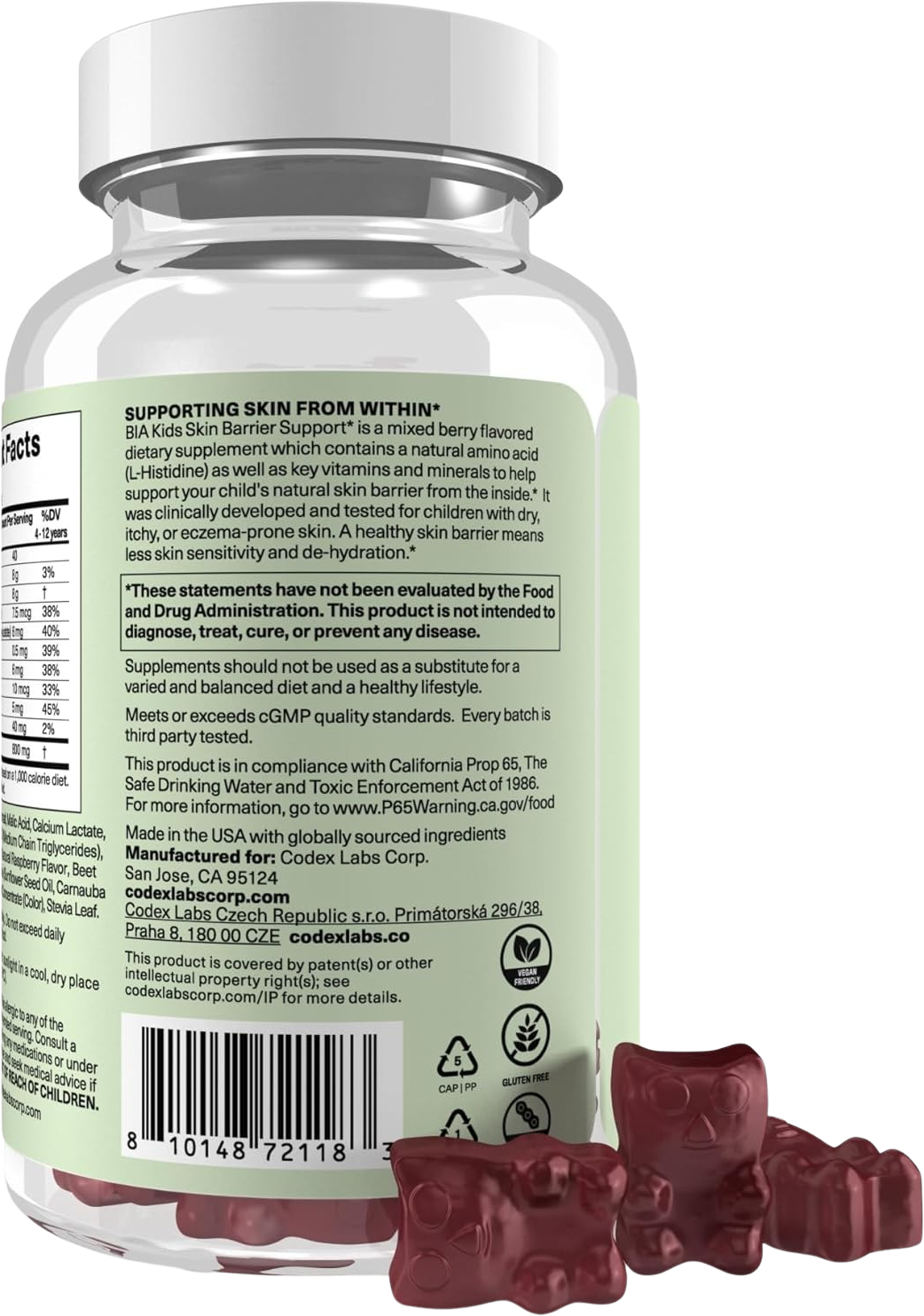 Codex Labs BIA Kids Skin Barrier L-Histidine Dietary Support - Gummy 60 ksVše o produktuDoplňující informaceHodnocení produktuBIA Kids Skin Barrier L-Histidine Dietary Support je denní doplněk stravy pro děti (4–12 let) ve formě veganských gumídků s příchutí lesního ovoce. Obsahuje L-histidin, vitaminy (D, E, B2, niacin, biotin) a zinek, které přispívají k udržení normálního stavu pokožky a podporují přirozené funkce kožní bariéry. Kožní bariéra hraje zásadní roli v ochraně pokožky – brání nadměrné ztrátě vody a pomáhá chránit před vnějšími vlivy. Pokud je narušena, může být pokožka citlivější, náchylnější k podráždění a suchosti. Protein filaggrin je klíčovou součástí přirozeného hydratačního faktoru a přispívá k soudržnosti kožních buněk. Jeho dostatečná tvorba podporuje optimální hydrataci a pevnost bariéry. L-histidin je aminokyselina, která se v těle využívá k syntéze filaggrinu. Kombinace aminokyseliny L-histidin s vitaminy (D, E, B2, niacin, biotin) a zinkem byla zkoumána v rámci klinických studií. Výsledky potvrzují význam těchto nutrientů pro podporu zdravě vypadající pokožky a její přirozenou obranyschopnost.