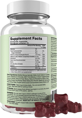 L-histidin, vitamin D (cholekalciferol), vitamin E (D-alfa-tokoferyl acetát), riboflavin, niacin (nikotinamid), biotin, zinek (citrát zinečnatý), maltitolový sirup, isomalt, kyselina jablečná, laktát vápenatý, pektin, chlorid draselný, MCT olej (triglyceridy se středně dlouhým řetězcem), citrát sodný, přírodní açaí, přírodní malinové aroma, prášek z červené řepy (barvivo), glazura ze slunečnicových semen (slunečnicový olej, karnaubský vosk), citrusová vláknina, koncentrát šťávy z fialové mrkve (barvivo), listy stévie.