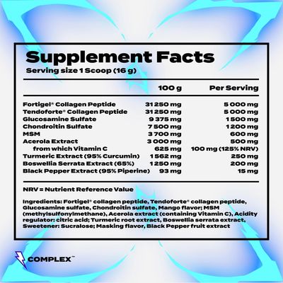 Complex™ Joint Care Ultra je kombinací 9 pečlivě vybraných látek v patentovaných formách, zaměřenou na každodenní péči o pohybový aparát. Základem složení jsou kolagenní peptidy Fortigel® a Tendoforte®, které pocházejí z hydrolyzovaného kolagenu typu I a II. Tyto peptidy jsou běžně využívány v produktech určených pro aktivní osoby a jsou předmětem řady odborných studií. Součástí komplexu jsou také glukosamin sulfát a chondroitin sulfát, látky běžně zařazované do doplňků výživy pro osoby se zvýšenou pohybovou zátěží. Ve složení nechybí ani MSM, který je standardní součástí sportovní suplementace.